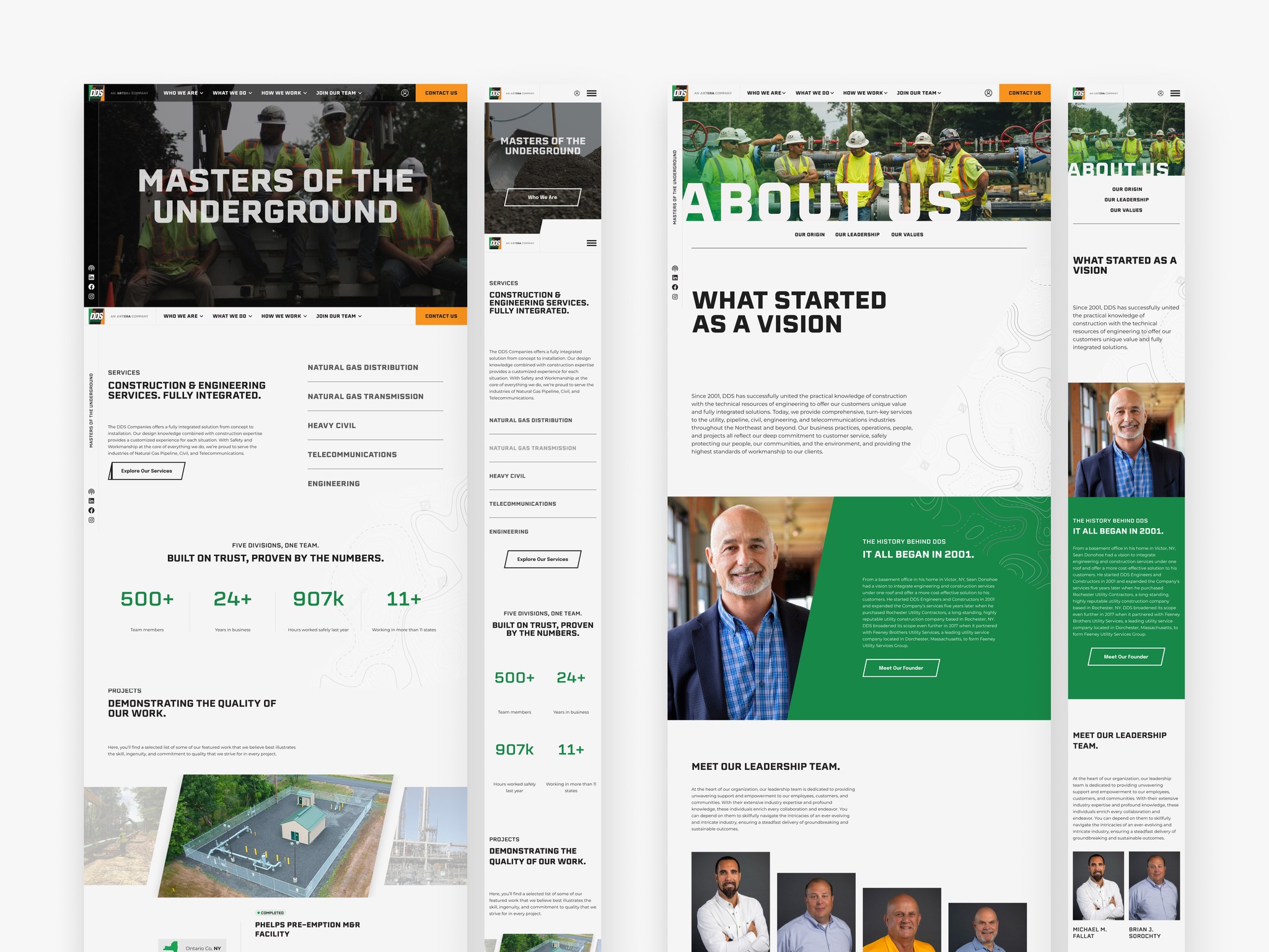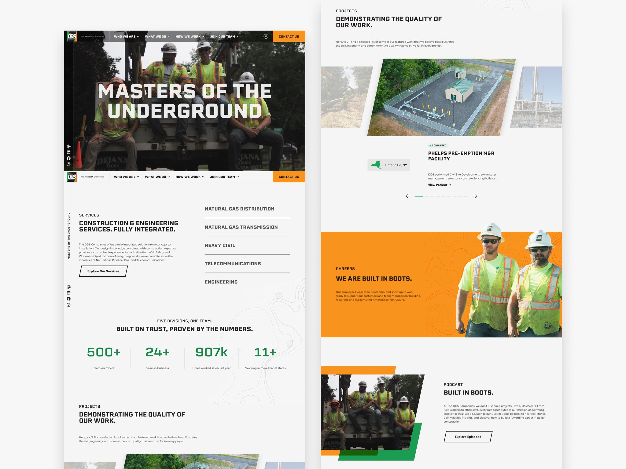 I restructured the site around a clearer hierarchy that showcased DDS’s core divisions—Natural Gas, Civil, Telecom, and Engineering—through visual cues and simplified navigation. The design introduced a modern visual system with stronger typography, improved spacing, and field-focused imagery that reflected the company’s expertise. Emphasis was placed on trust signals such as safety, training, and leadership, while ensuring the experience remained seamless and accessible across all devices.
