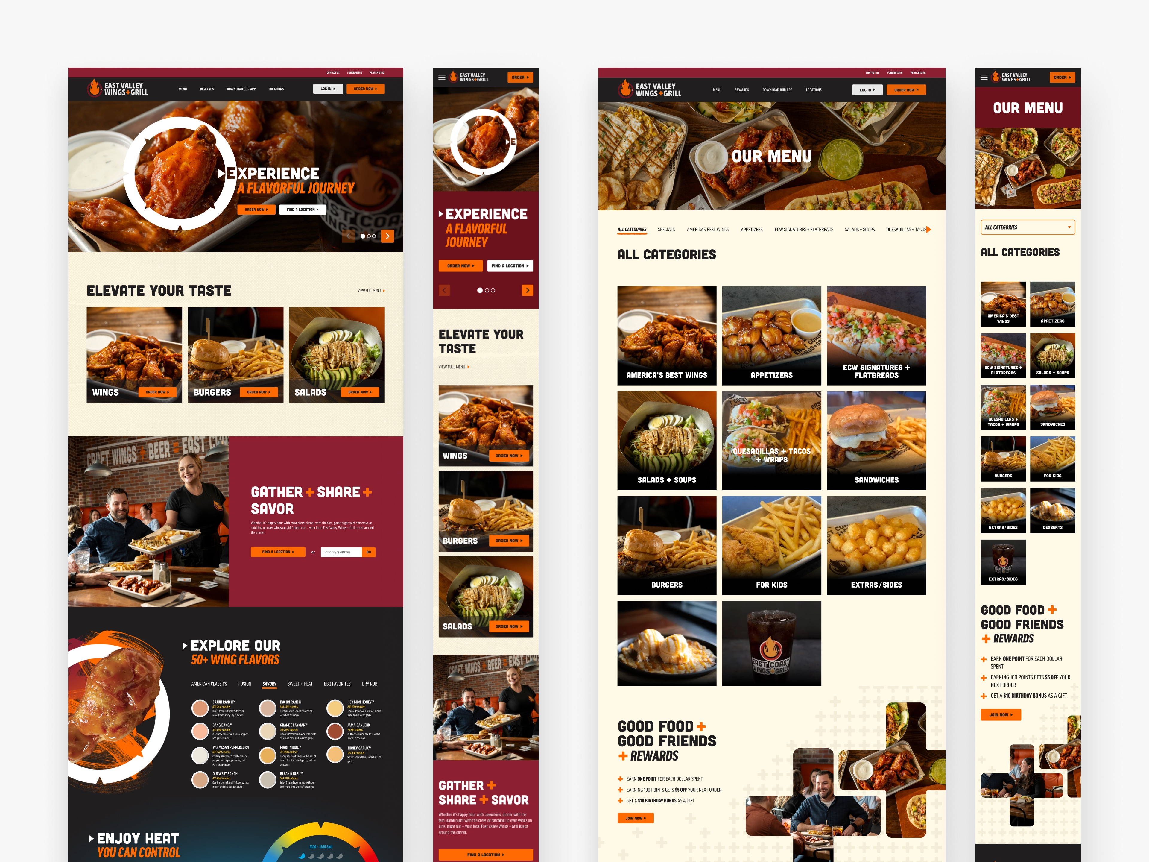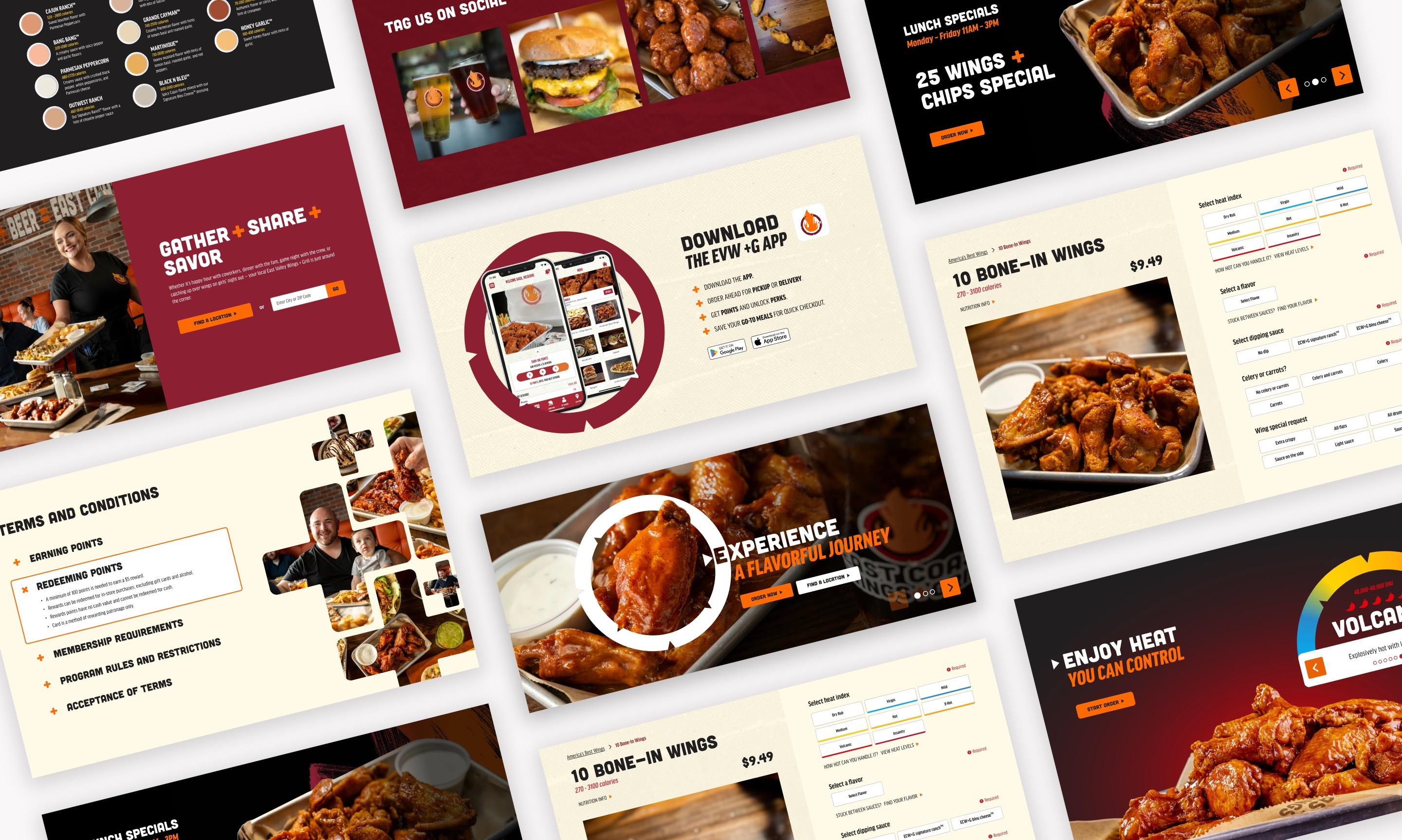 I reimagined the experience around storytelling and usability — merging the brand’s lively personality with a streamlined digital flow. The visual system leaned into warm, rich tones and textured food photography to evoke heat, flavor, and freshness. Interactive elements like the Flavor Heat Index Slider and Explore Our 50+ Wing Flavors guided users through the menu in an engaging, game-like way — allowing them to explore sauces by spice level or create custom combinations that felt uniquely theirs.